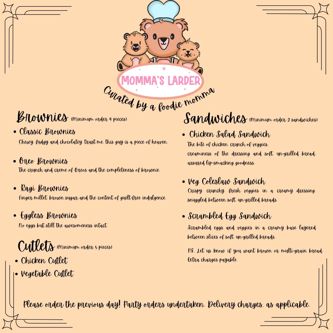 Hello, everyone! We are super happy and excited to launch new venture ‘Momma’s Larder’. Long story short, after catering to friends and family for more than 5 years, and a short break, we have decided to explore new horizons. ‘Momma’s Larder’ is basically a small range of comfort food with fresh ingredients, and preparation starts only after the orders are received with mild spice/seasoning which means the food is extremely pleasant on the senses, the body and the mind. Since everything is customized, we request you to pre-order your requirements. We could also pack you a picnic. All you have to do is get in touch with us Through our Instagram to know more
